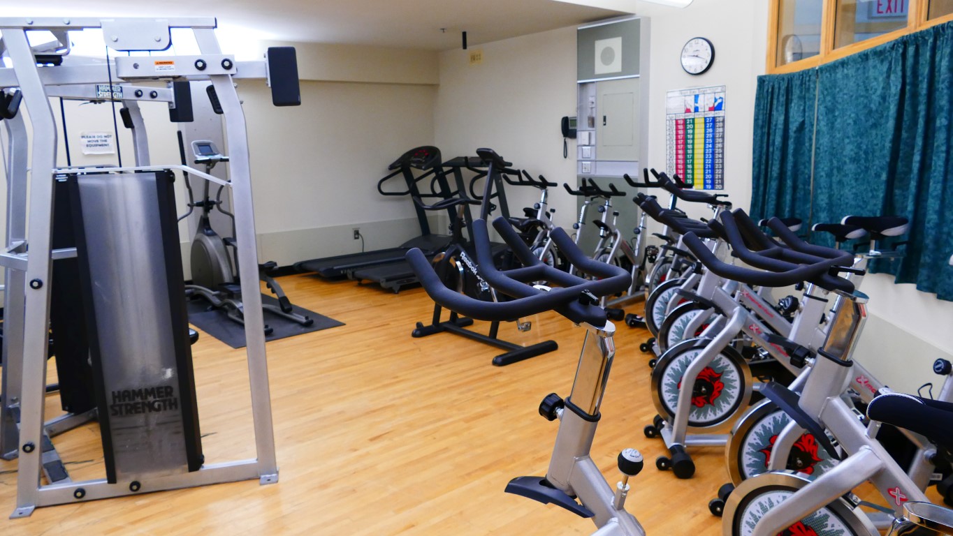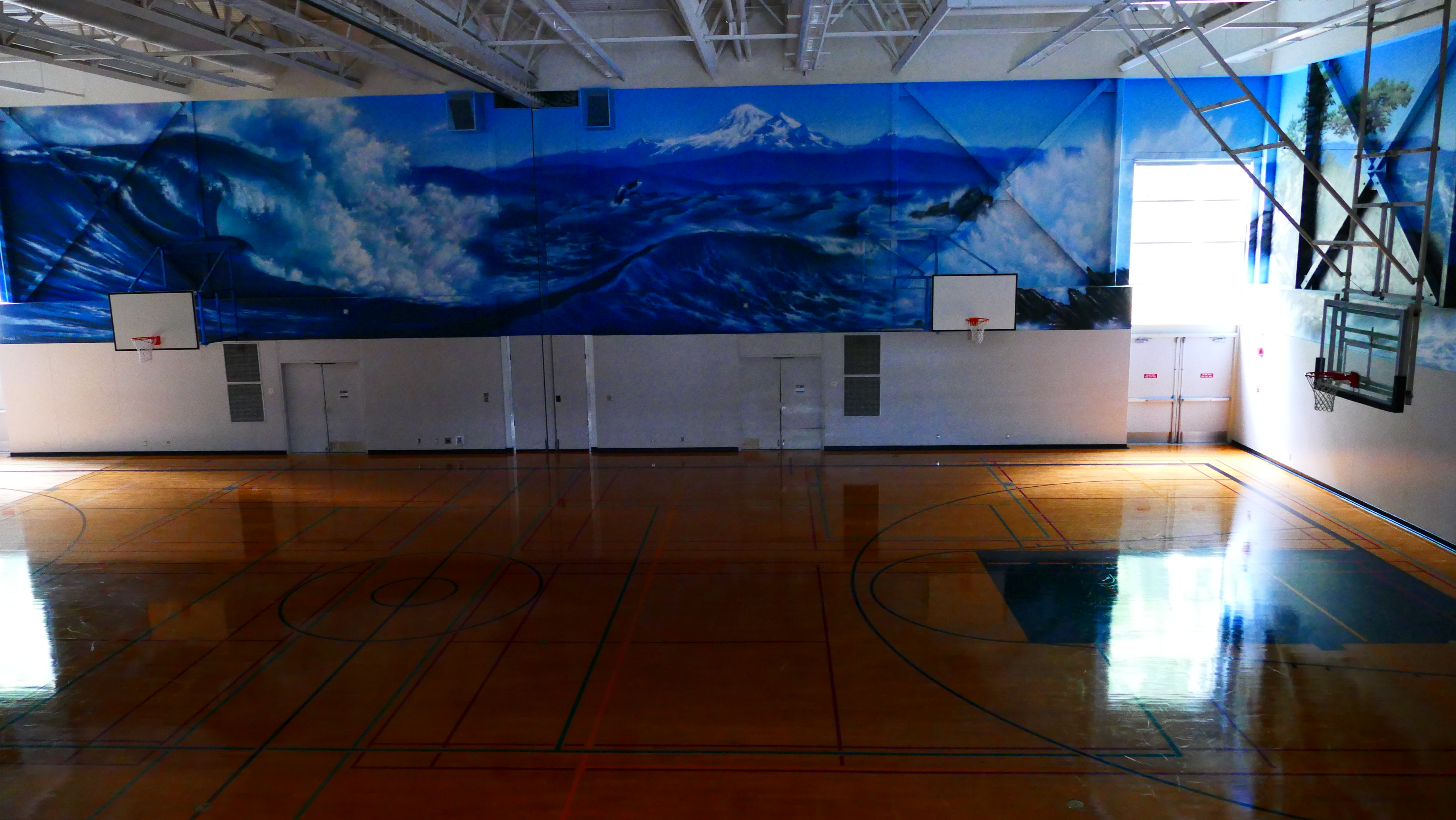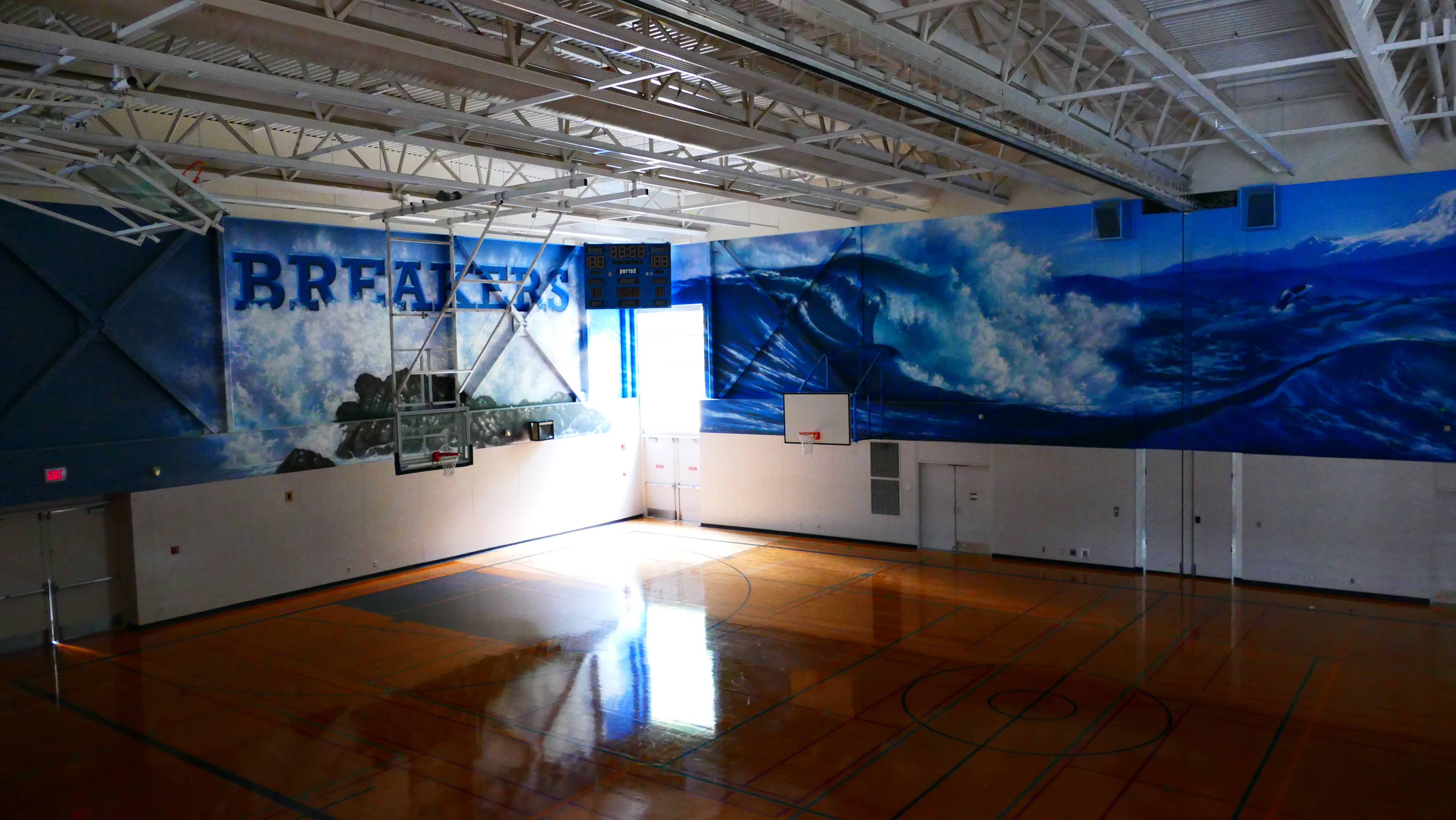 Im nächsten Raum findet gerade eine Yoga Klasse statt. Das Maskottchen der Schule sind die „Breakers“.