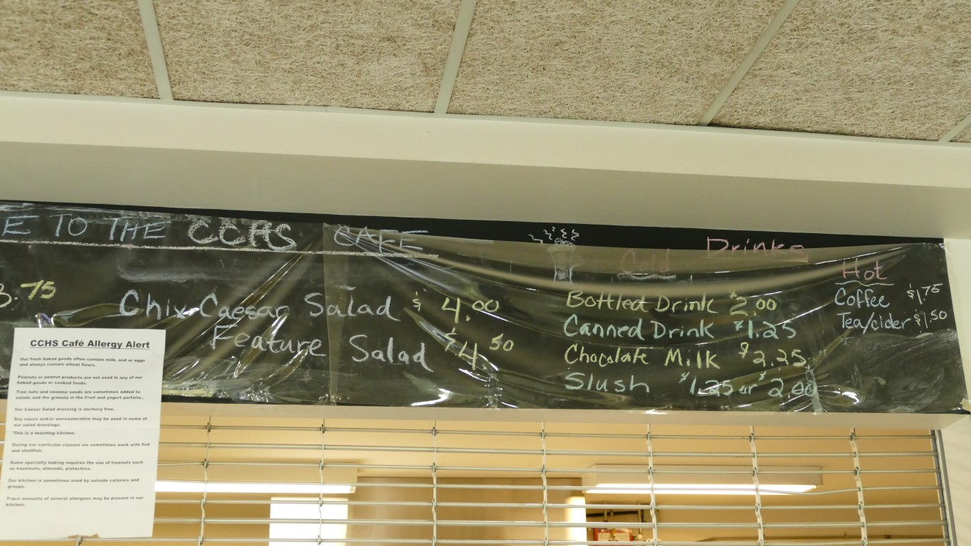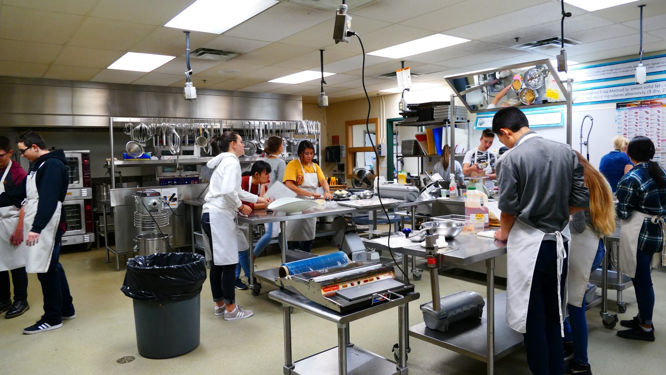 Ich hatte auch die Gelegenheit mit der Lehrerin des Foods-Kurses zu sprechen, die übrigens seit 3 Jahren deutsche Austauschschüler bei sich zu Hause aufnimmt. Von einem Schüler sei schon die ganze Familie zu Besuch gewesen. Alle zusammen waren eine große Familie, ein deutscher und ein kanadischer Teil. Toll, so etwas von einer Gastmutter zu hören. Die „Food“-Klasse hat mich besonders beeindruckt. Die Lehrerin meinte, sie hätte letzte Woche zu Beginn des Schuljahres mit den Schülern besprochen, was sie gerne in diesem Kurs lernen möchten. Schon alleine, dass sie dies fragt, finde ich bewundernswert. Ein Schüler antwortete, dass „ich ohne meine Mutter kochen kann, wenn ich später einmal ausziehe“. Ja, wie logisch das ist. Learning by doing. Es geht nicht nur um das Kochen. Die Schüler verkaufen ihr gekochtes Essen in der Mensa, an die Schüler und an die Angestellten der Schule, zum Mitnehmen als Familienabendessen, machen das Catering für Events. Sie lernen Angebot und Nachfrage, Kalkulation, Wareneinsatz, Preisgestaltung, usw. Es ist eben nicht „nur“ das Kochen.