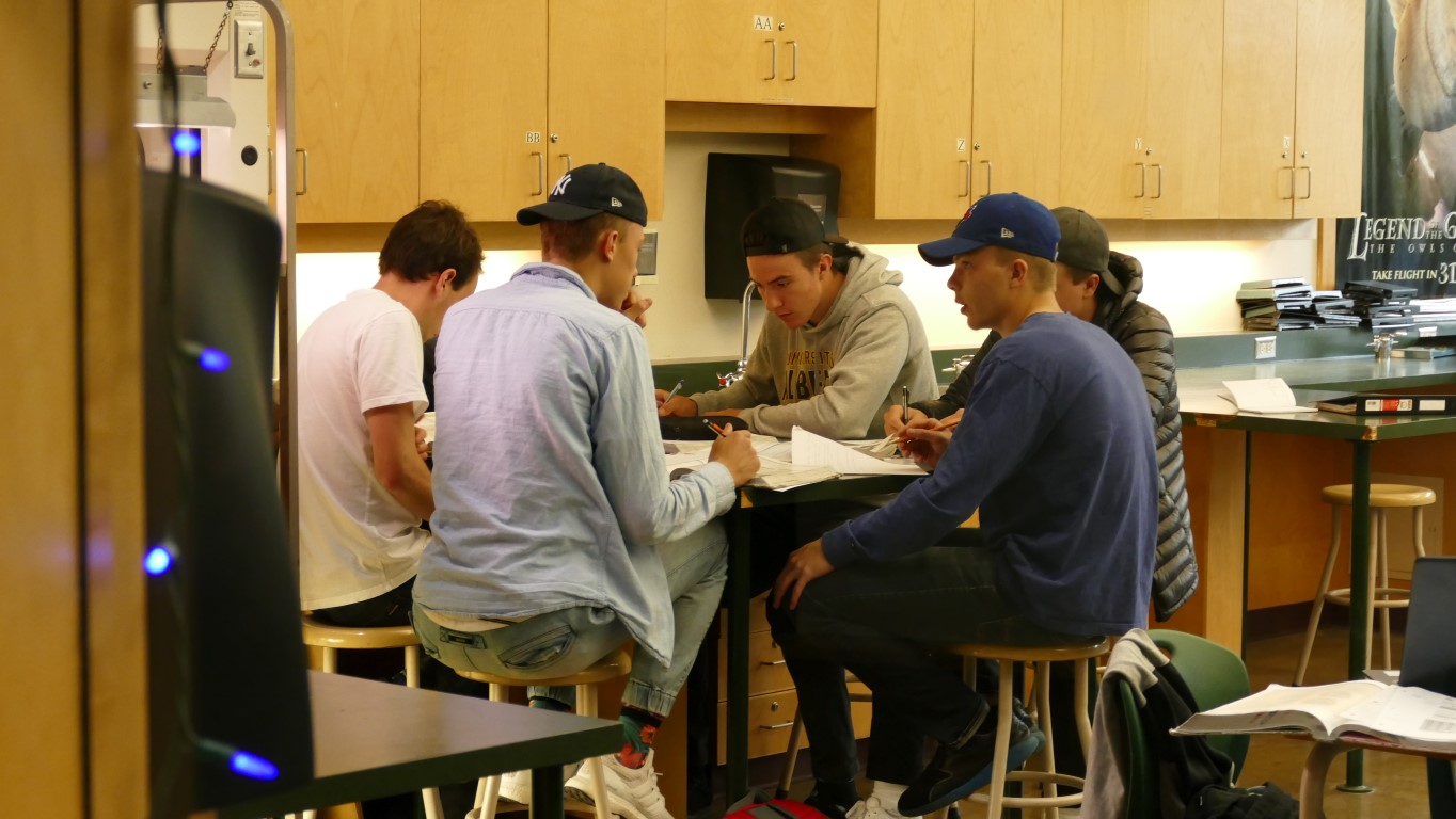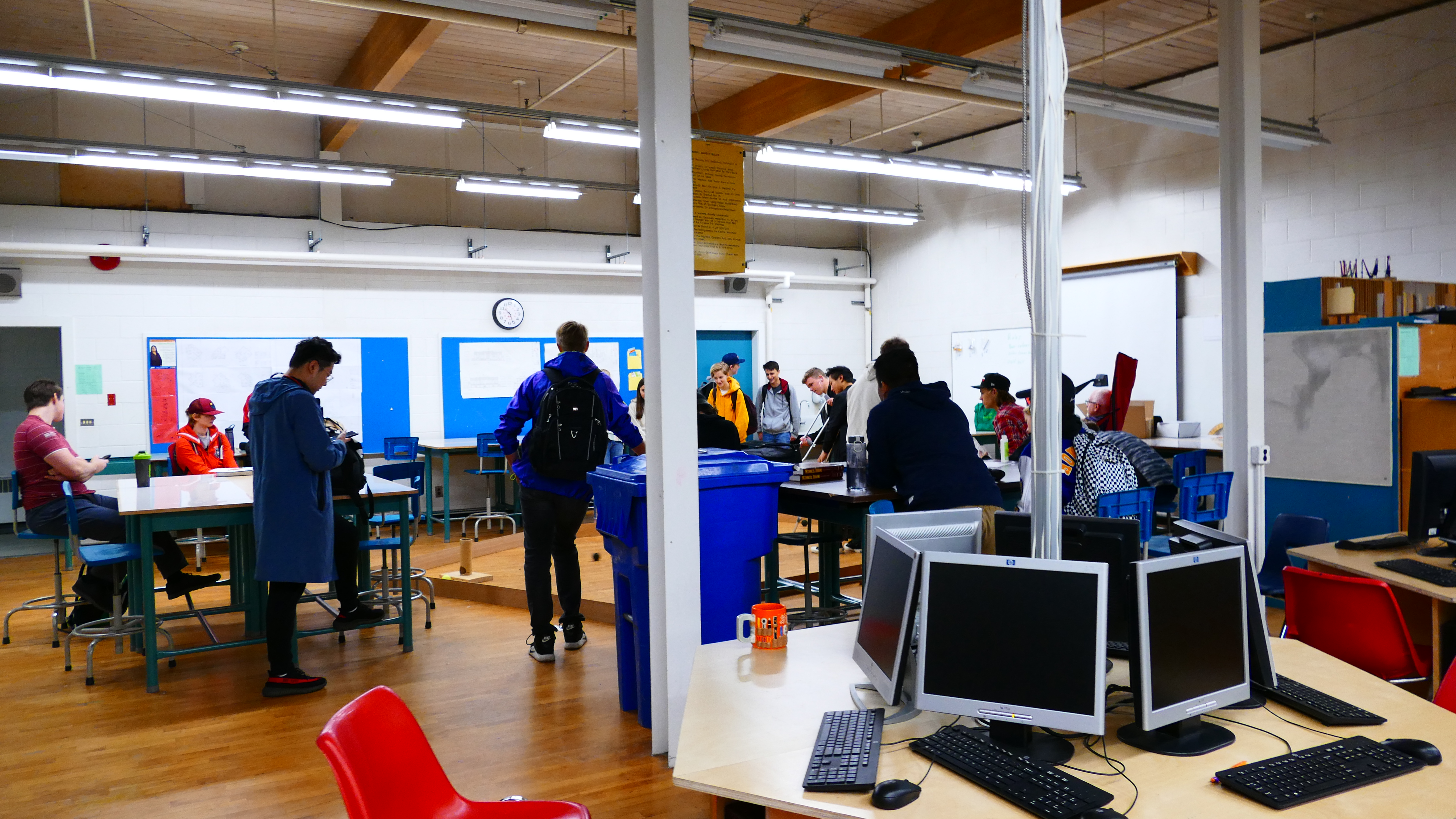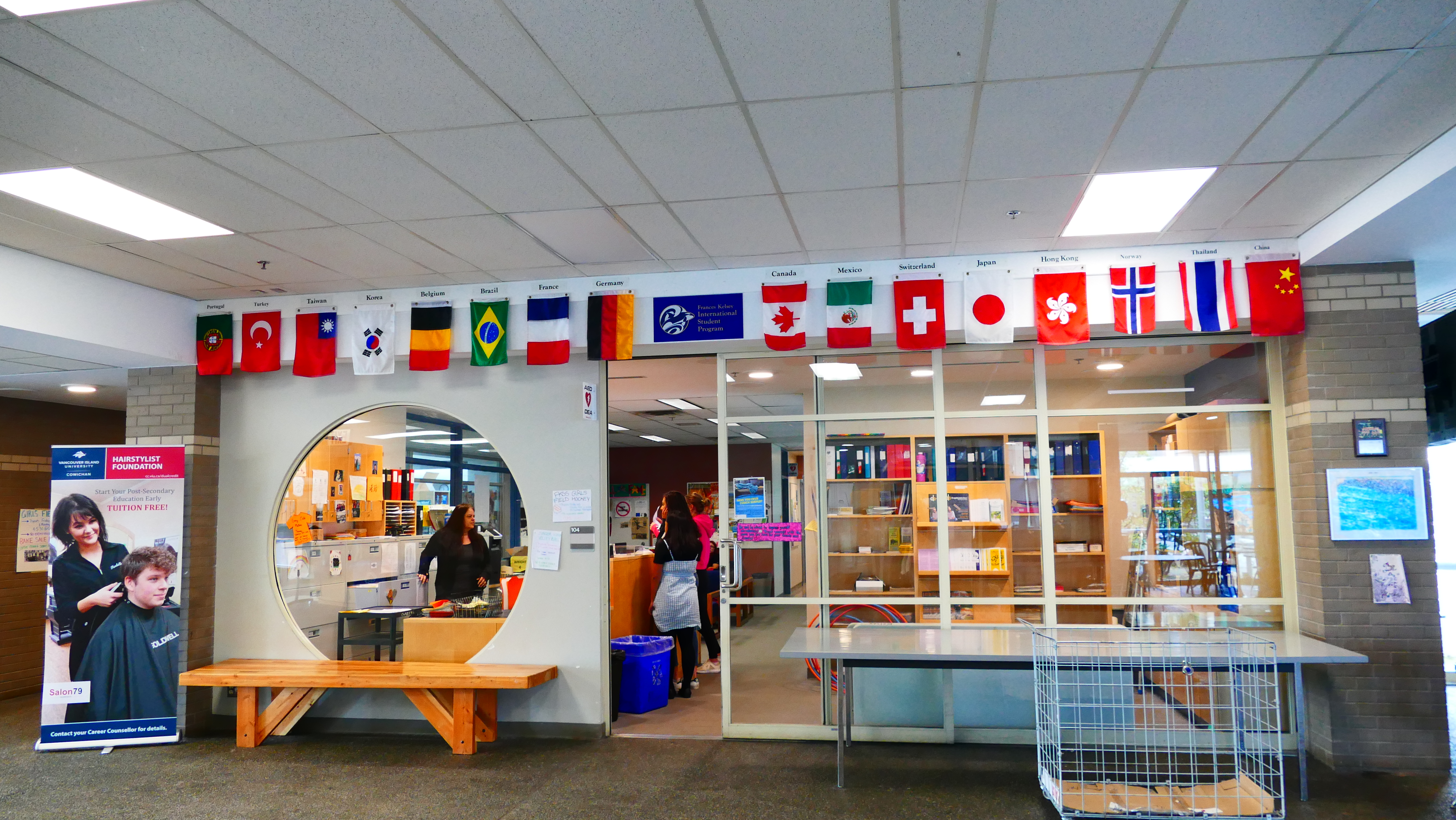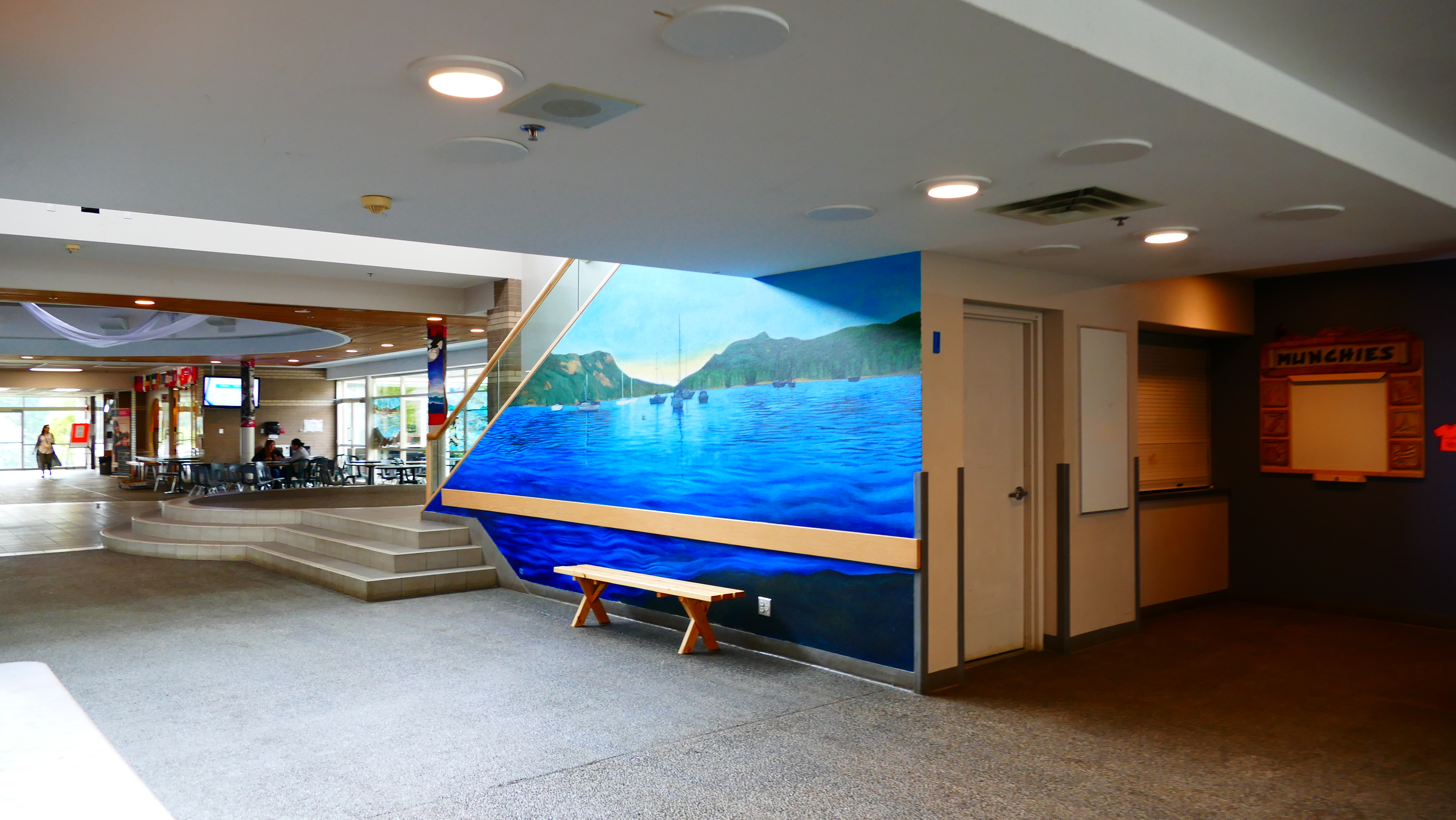 Die Ansprechpartner für alle Schüler sind direkt am Eingang und immer da, wenn man sie braucht. Der Homestay Koordinator wird auf unserem Rundgang immer wieder von Schülern angesprochen, ob er mal kurz Zeit hätte. Natürlich hat er die! Er kommt mir vor wie ein großer Bruder, guter Freund. Mir fällt außerdem ein Aushang auf, wo kanadische Schüler als Englisch-Tutoren für die Internationals gesucht werden – so geht Integration. An der Schule gibt es einen akademischen Trakt und einen für die praktischen Fächer. Die Howe Sound Secondary unterrichtet im Semestersystem. Man wählt vier Fächer, davon zwei oder drei akademische und ein oder zwei praktische. Diese werden dann jeden Tag unterrichtet, allerdings immer in einer anderen Reihenfolge: Montags ABCD, Dienstags CDAB, Mittwochs BACD, Donnerstags DCBA und Freitags ABCD. Jeder Schüler hat ja doch einen anderen Biorhythmus und so hat man die Chance, mal mehr oder weniger fit zu sein in jedem Fach. Das gefällt mir.