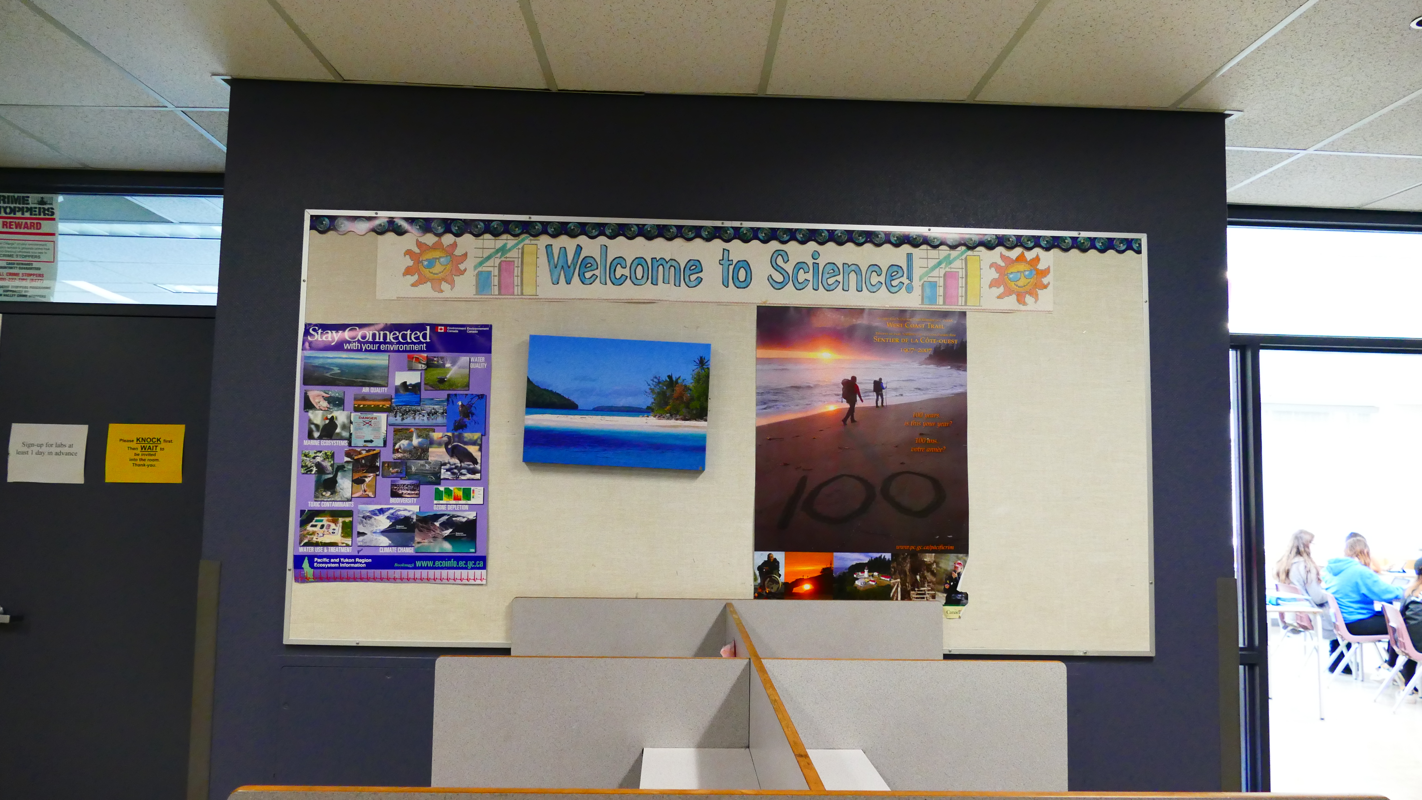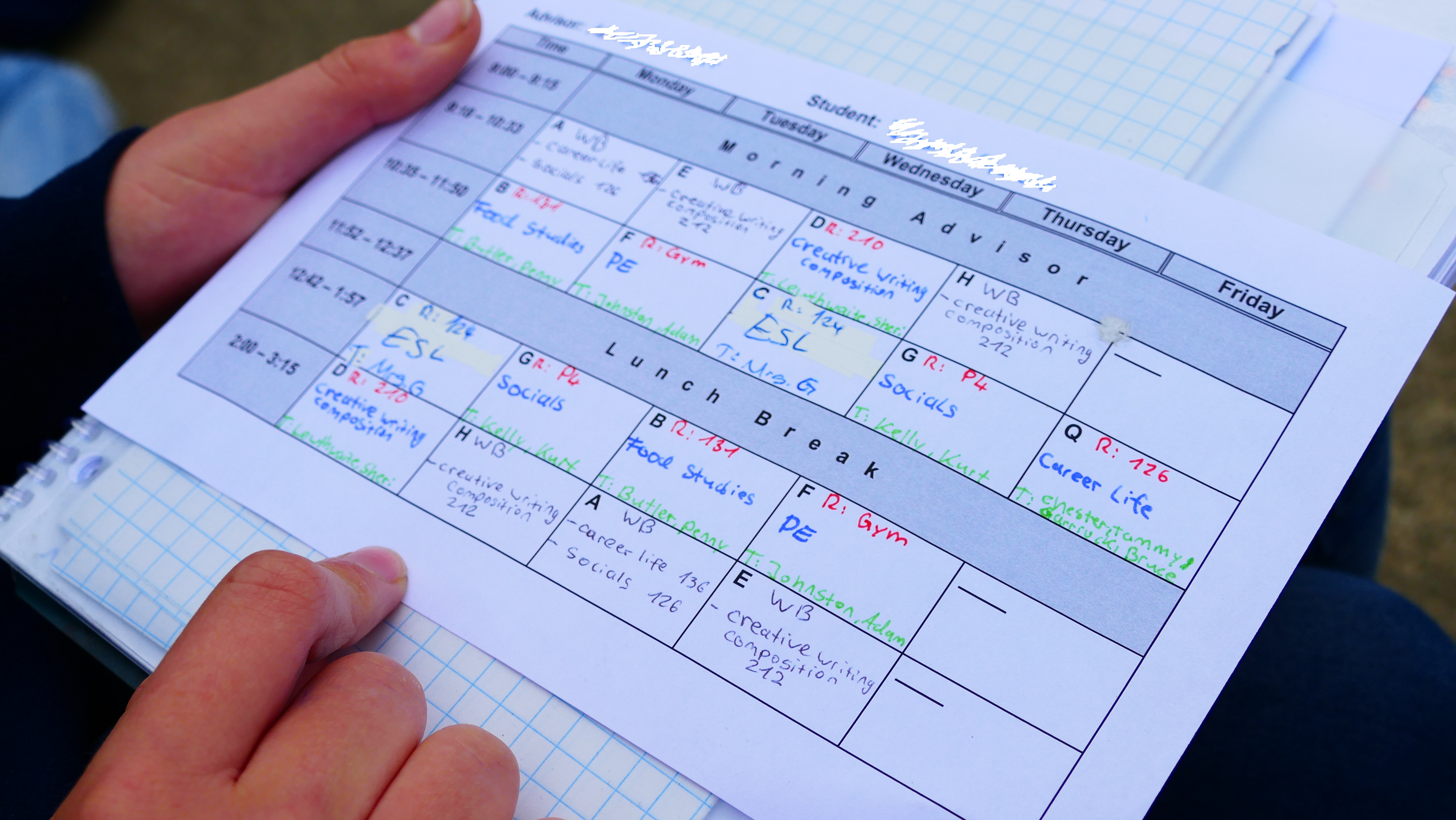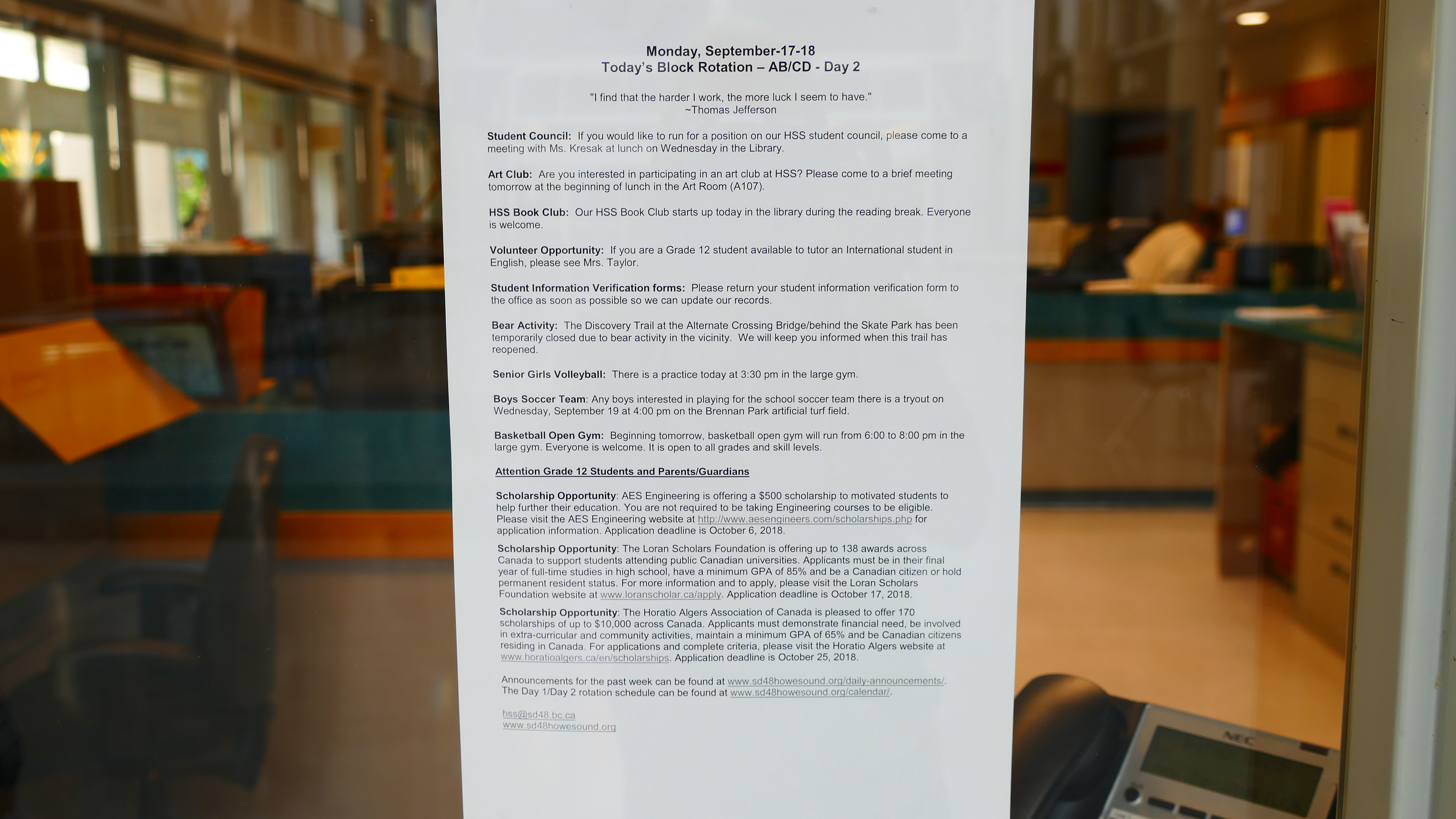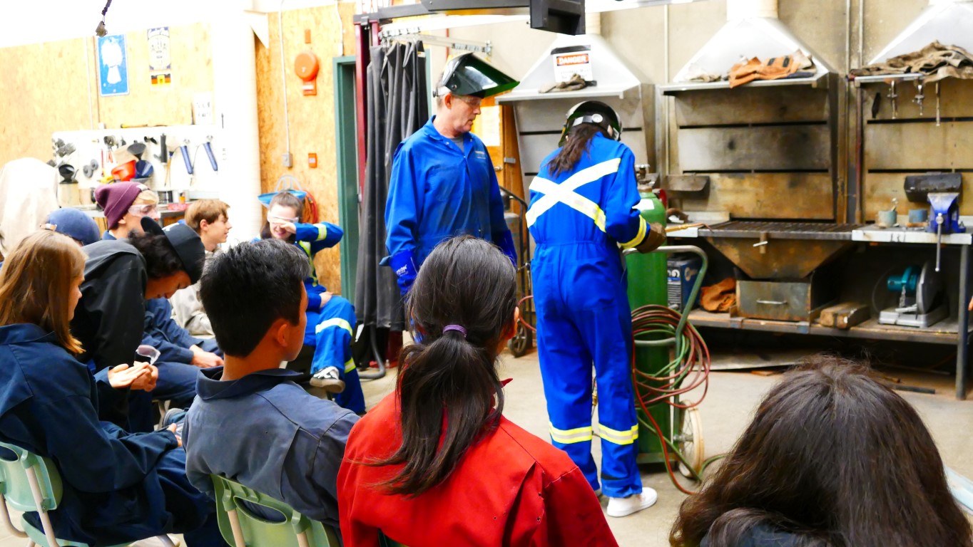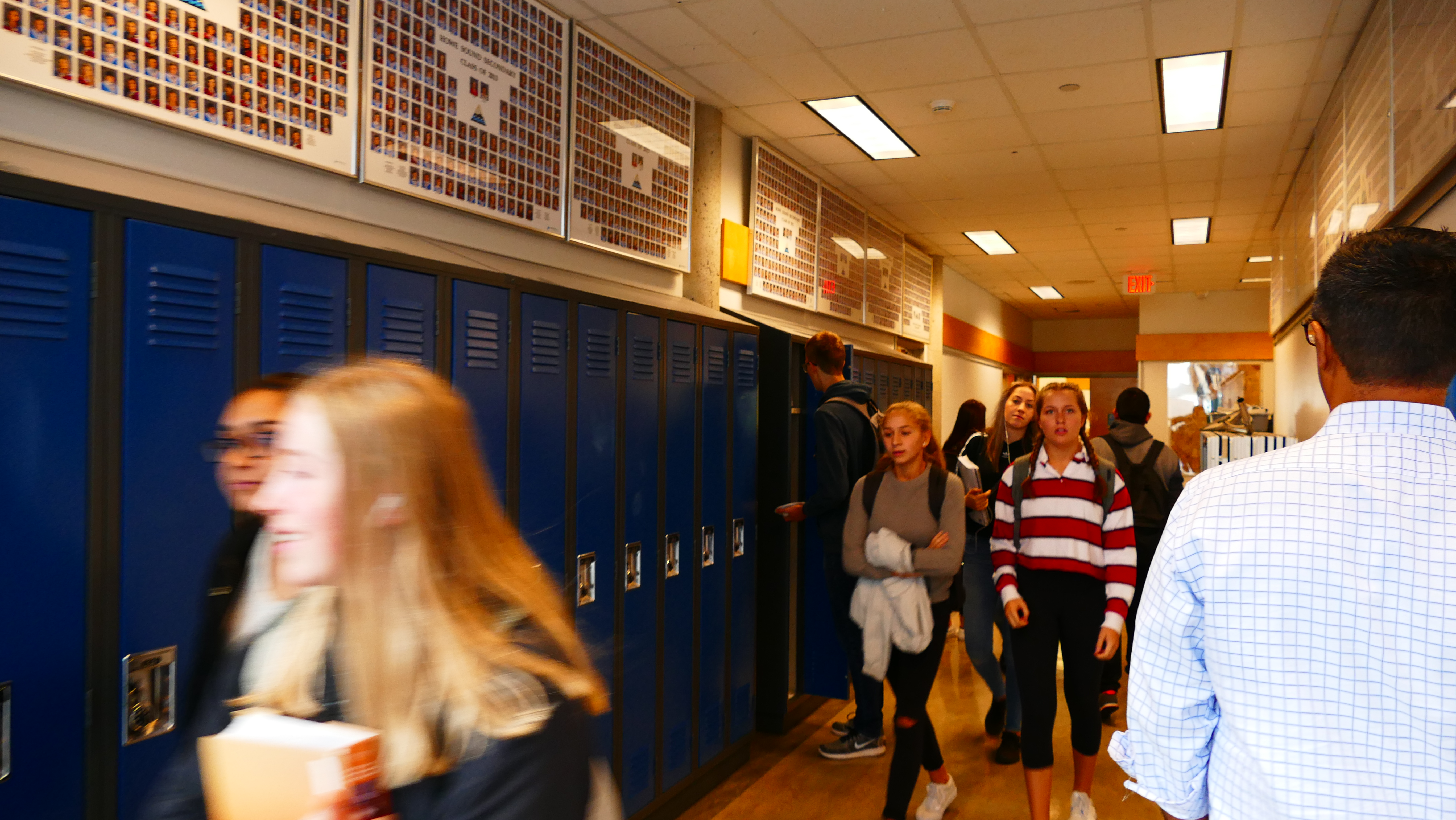 Die Ansprechpartner für alle Schüler sind direkt am Eingang und immer da, wenn man sie braucht. Der Homestay Koordinator wird auf unserem Rundgang immer wieder von Schülern angesprochen, ob er mal kurz Zeit hätte. Natürlich hat er die! Er kommt mir vor wie ein großer Bruder, guter Freund. Mir fällt außerdem ein Aushang auf, wo kanadische Schüler als Englisch-Tutoren für die Internationals gesucht werden – so geht Integration. An der Schule gibt es einen akademischen Trakt und einen für die praktischen Fächer. Die Howe Sound Secondary unterrichtet im Semestersystem. Man wählt vier Fächer, davon zwei oder drei akademische und ein oder zwei praktische. Diese werden dann jeden Tag unterrichtet, allerdings immer in einer anderen Reihenfolge: Montags ABCD, Dienstags CDAB, Mittwochs BACD, Donnerstags DCBA und Freitags ABCD. Jeder Schüler hat ja doch einen anderen Biorhythmus und so hat man die Chance, mal mehr oder weniger fit zu sein in jedem Fach. Das gefällt mir.