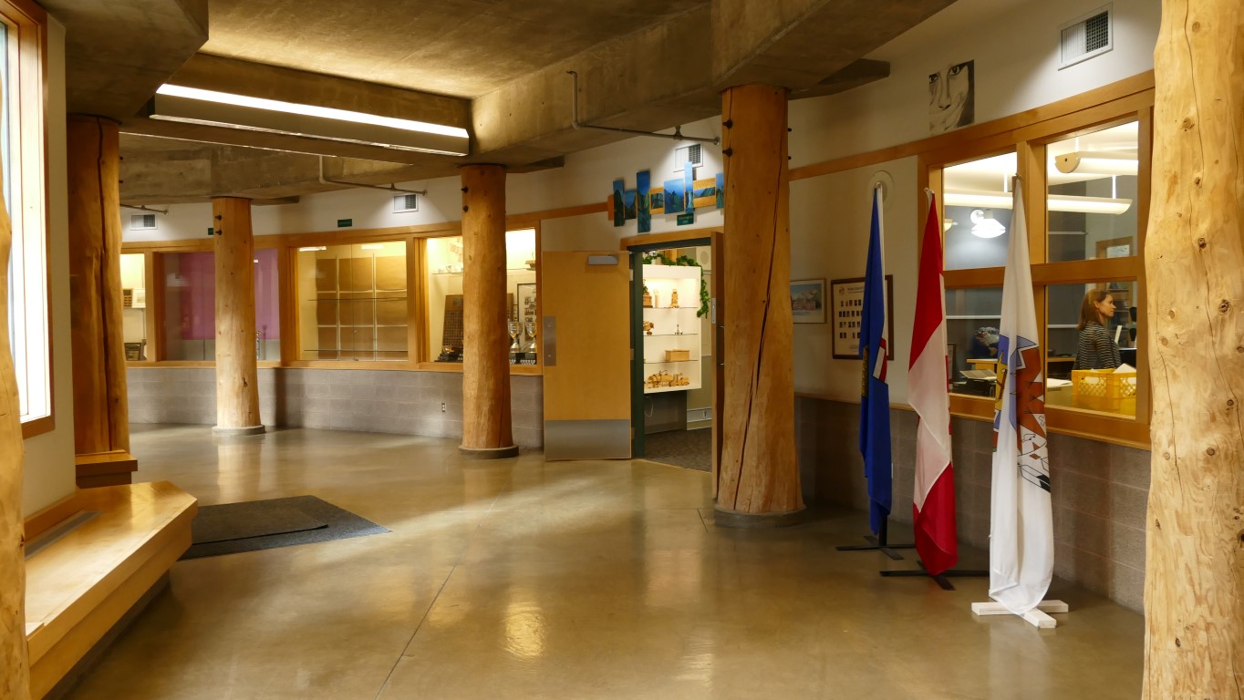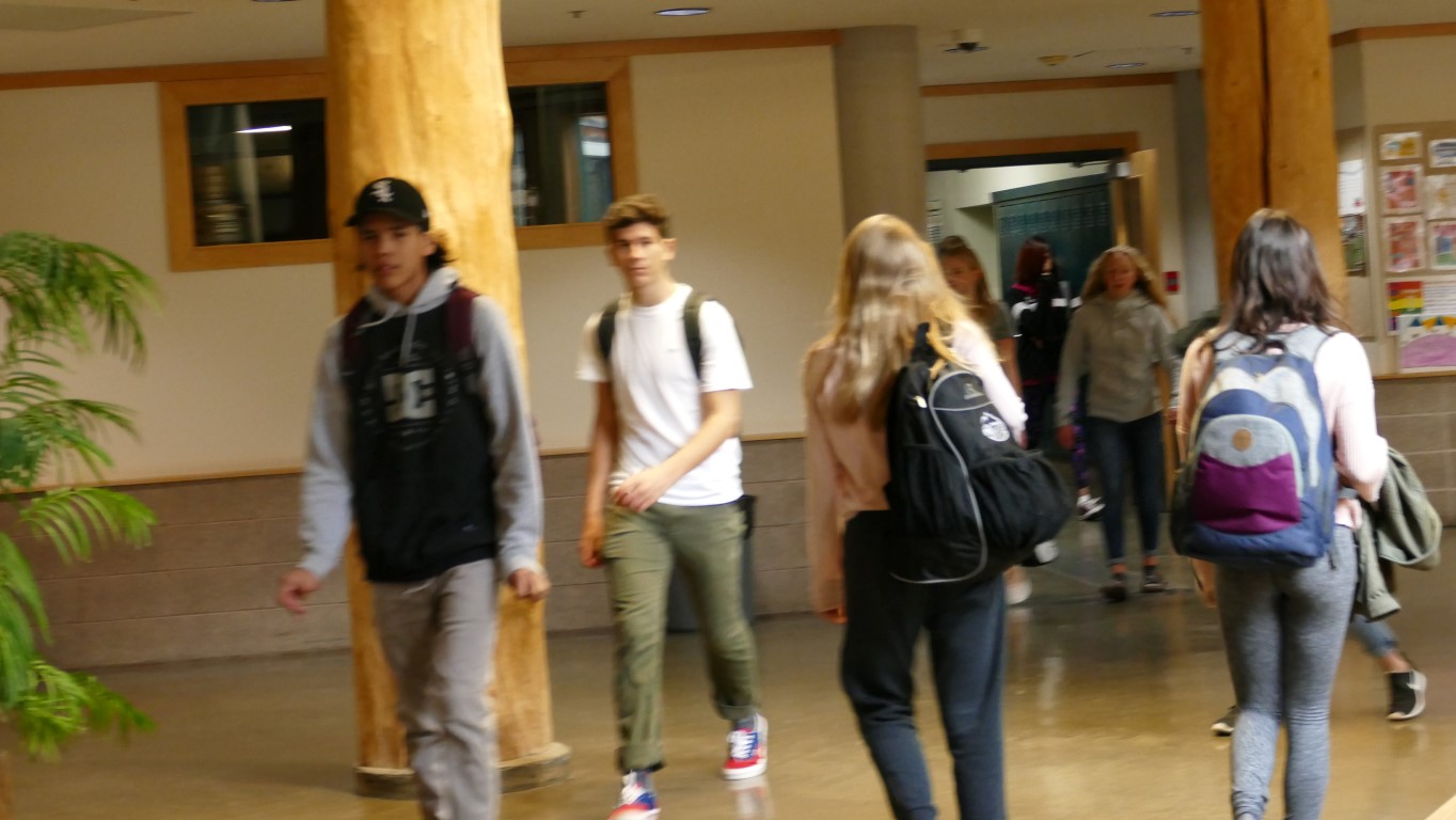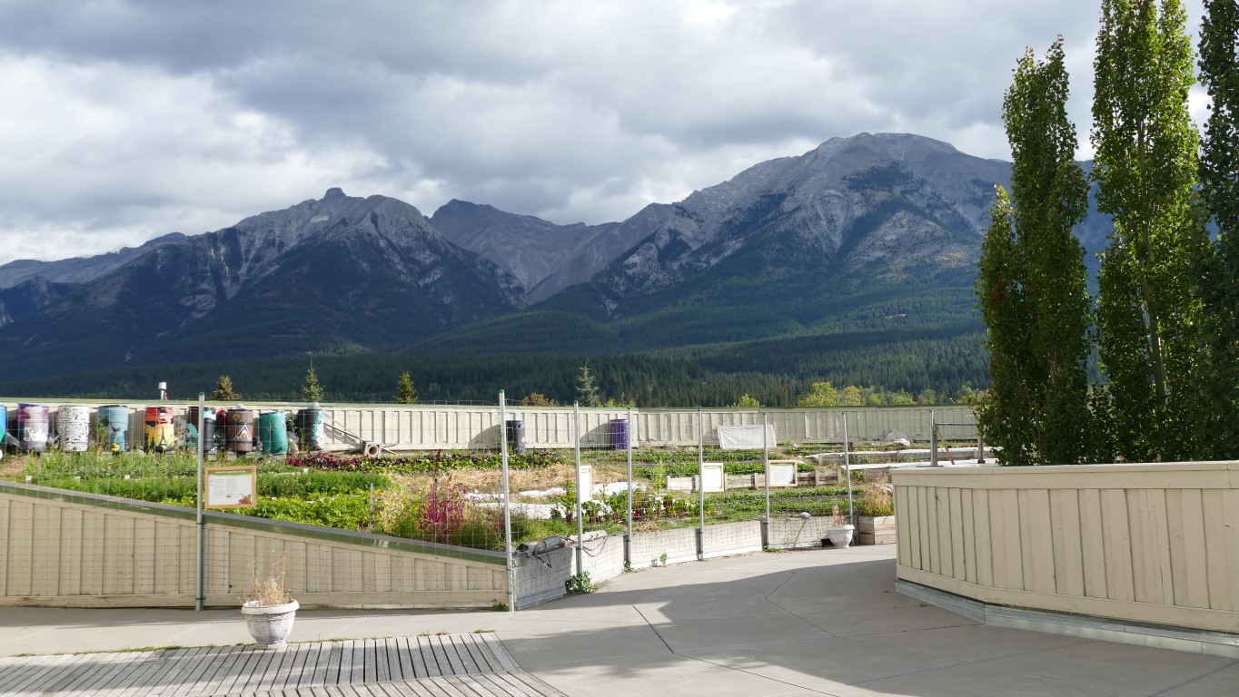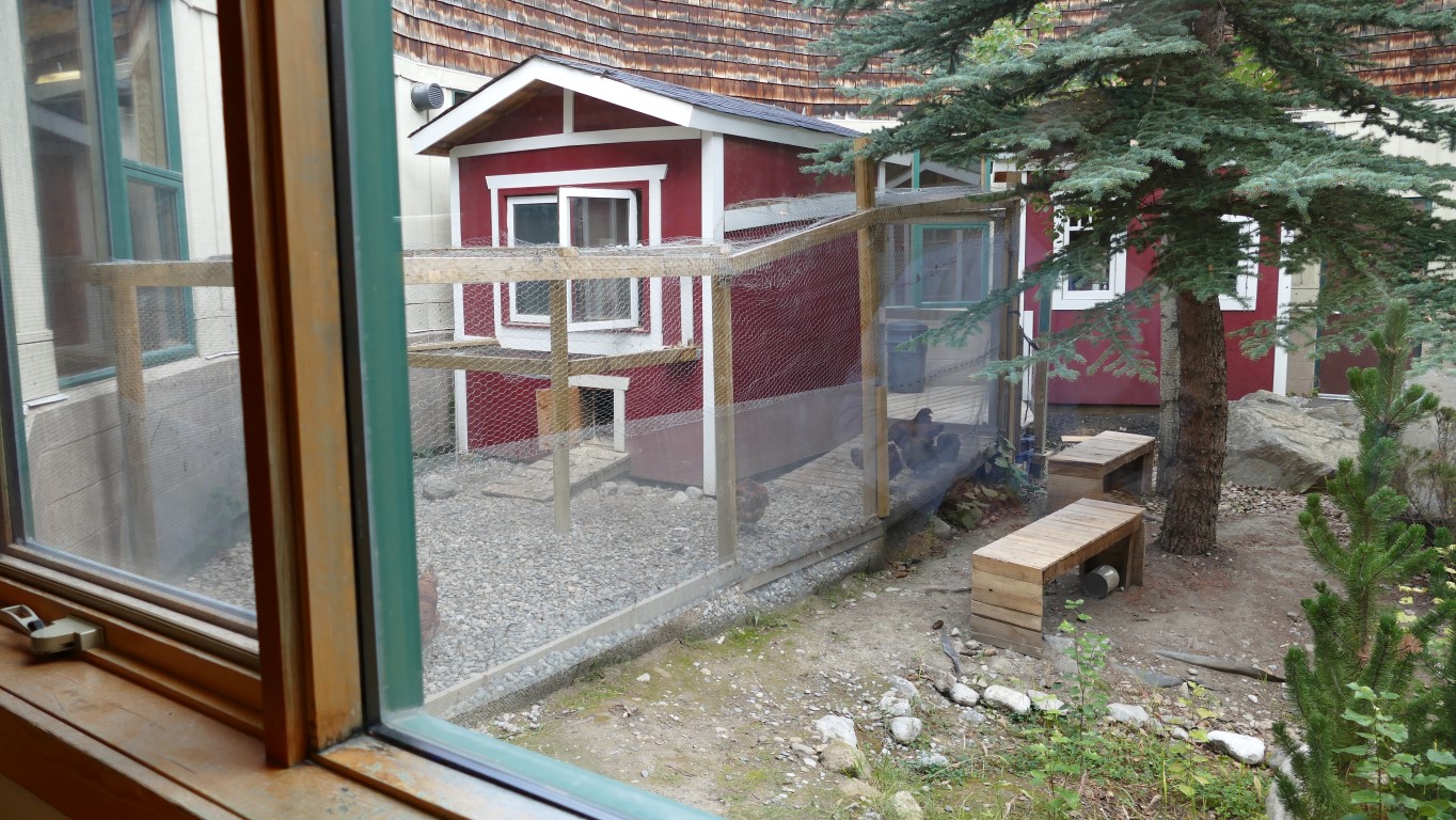 Mein erster Schulbesuch! Mitten in den Rocky Mountains! Die Canadian Rockies Public Schools. Dazu gehört die Canmore Collegiate High School und die Banff Community High School. Wir sind hier mitten in den Bergen. Die High School in Canmore hat um die 400 Schüler, davon etwa 40 Austauschschüler und in diesem Jahr 14 davon aus Deutschland. Steve, Director of Technology, Learning and Facilities, meinte, die Deutschen freuen sich am meisten auf die Skisaison. Man kann es sich kaum vorstellen, aber innerhalb von 20 Minuten ist man hier in drei großen Skigebieten. Die Wochenenden gehören den Bergen. So ist das hier. Outdoor gehört dazu. Es ist eben das, was sie hier haben. Und es könnte nicht schöner sein. Der Eingang der Schule führt in ein Rondell, was die Aula darstellt. In der Mitte dieses Rondells, welches verglast ist, wohnen – kein Witz – Hühner. Es ist eine besondere Art Hühner, denen die Kälte nichts ausmacht. Das sollte es hier auch, immerhin ist Anfang September und es ist Schnee angesagt für die nächsten Tage.