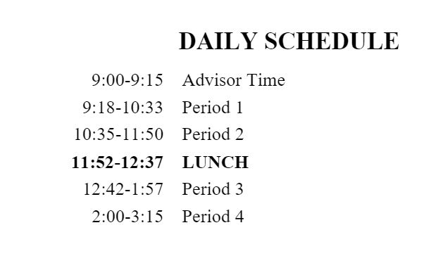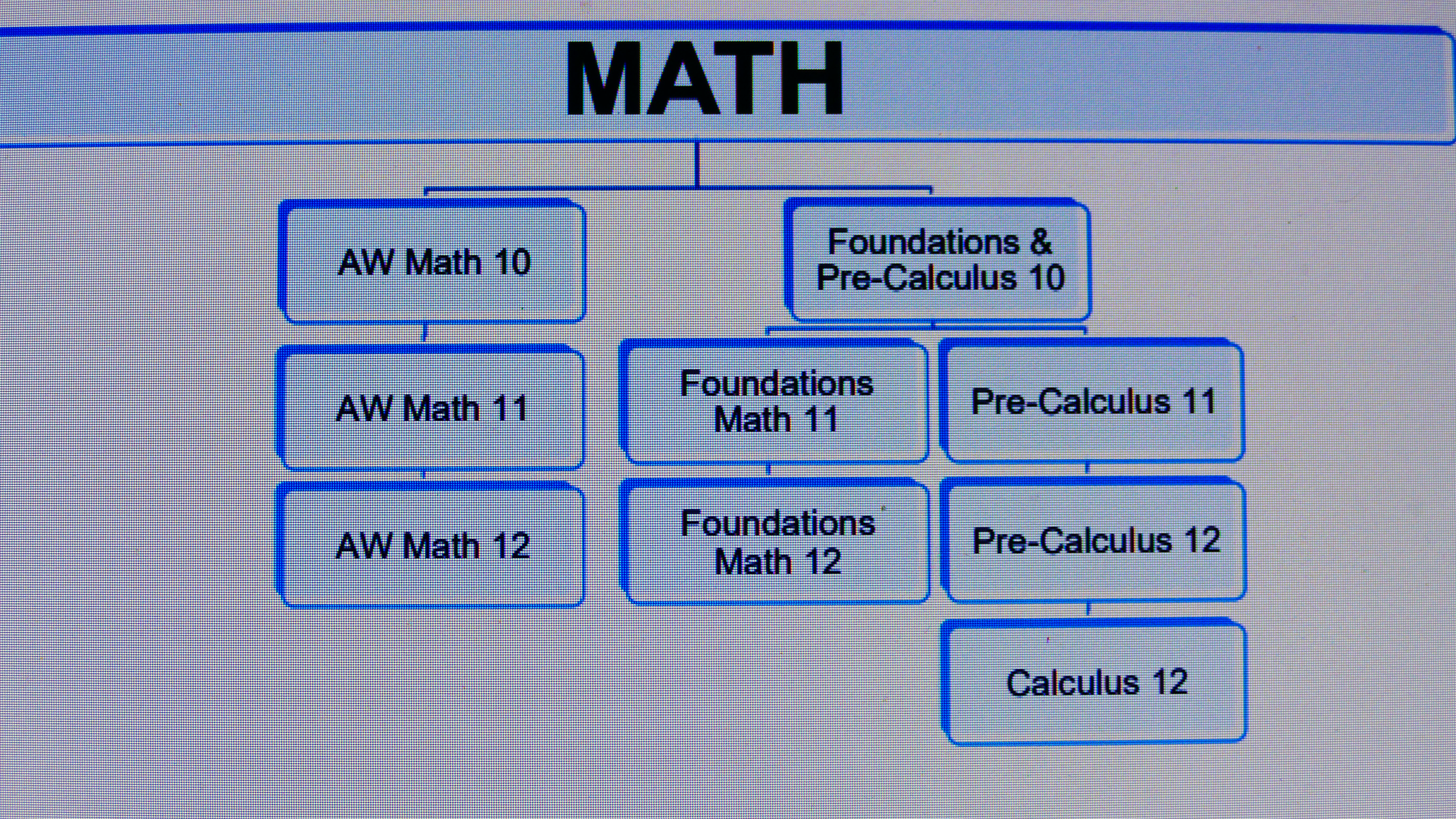 English, Maths, Social Studies, Science (Physik, Biologie, Chemie), PE (Sport), Personal Fitness, Career and Life Management, Art, Mechanics, Constructions, Gardening, Foods, WILD (outdoor education), Drama, Media and Design, Music, Jazz and Concert Band, Foods, Leadership, Forensics, Psychology, French. Es werden AP Kurse angeboten und French immersion.